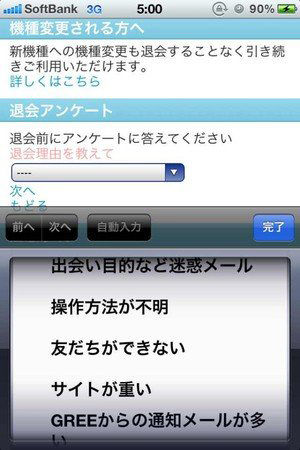 GREEのアカウント消してきた。退会理由の選択肢がひどいwwそれと、一番最後に退会アンケート記入してくれってところに文字を入力出来ないトラップがあってかなりひどいな